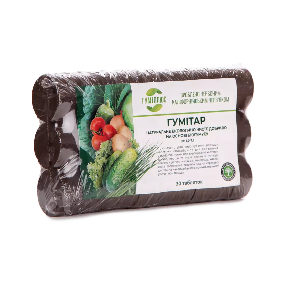 Гумітар – натуральне екологічно чисте добриво на основі біогумусу (вермікомпосту). Таблетки – діаметр – 30 ± 2 мм, висота – 14 ± 2 мм.